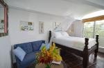 The Fan sits nestled in a tropical forest where hummingbirds feed on exotic flowers. Two apartments of one bedroom, bathroom, living room and kitchen are available for rent. The upstairs apartment is the master suite. The downstairs apartment is equipped with a couch that pulls out into a double bed.